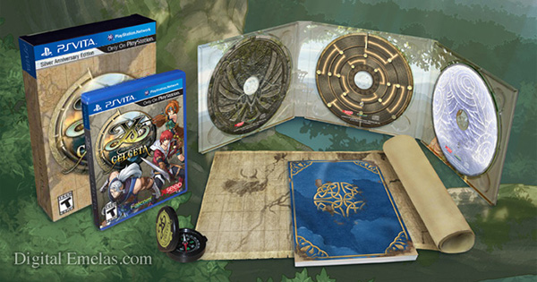 This Silver Anniversary Edition included a Collectible Box, Cloth Map of the Lands of Celceta, a working Compass, a copy of Adol's Travel Journal (120-page Art Book and Strategy Guide), a 3-Disc Soundtrack packed with music from the history of Ys, and the Standard Edition game.